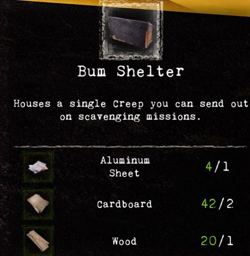 Trước tiên, người chơi cần đầu tư vào việc xây dựng một hệ thống các căn cứ trú ẩn cho người vô gia cư (Bum Shelters). Với số vốn 10.000 đô la, bạn có thể sở hữu tới 15 căn cứ.