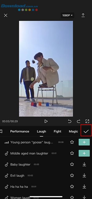 Khi đã chọn được âm thanh và nhạc nền phù hợp, hãy nhấn vào biểu tượng dấu tích ở góc trên cùng bên phải màn hình để xác nhận và lưu các thay đổi.