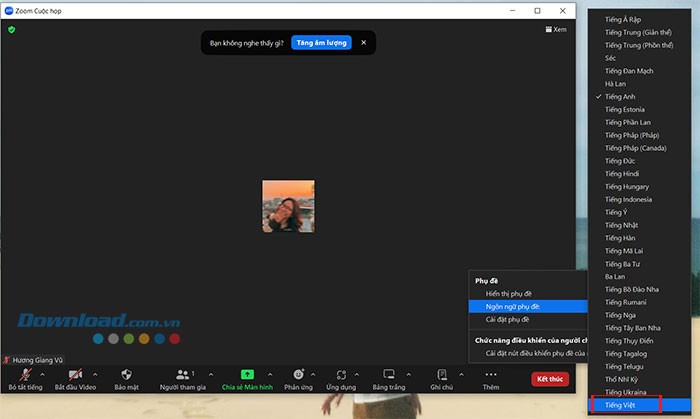 Bước 2: Chọn vào mục "Ngôn ngữ phụ đề" và lựa chọn "Tiếng Việt" để kích hoạt phụ đề bằng tiếng Việt trong cuộc gọi Zoom. Người tham gia cũng có thể chọn một ngôn ngữ khác phù hợp với nhu cầu sử dụng của mình.