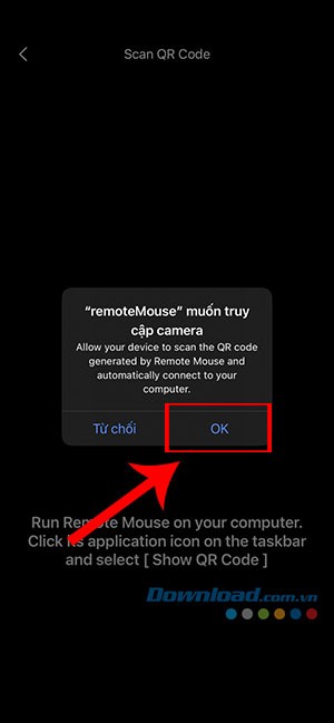 Bước 6: Xác nhận quyền truy cập camera cho ứng dụng bằng cách nhấn OK và sử dụng camera để quét mã QR hiển thị trên máy tính ở bước 3.