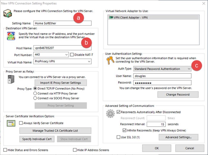 Bước 3: Nhấp đúp vào Add VPN Connection một lần nữa để mở ra cửa sổ New VPN Connection Properties. Các thông số cấu hình chính xác sẽ phụ thuộc vào cách máy chủ SoftEther được thiết lập, tuy nhiên, những yêu cầu tối thiểu cần được thực hiện bao gồm: