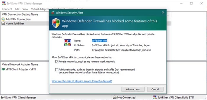 Bước 4: Để kết nối, đơn giản chỉ cần nhấp đúp vào kết nối VPN vừa được tạo. Lần đầu tiên thực hiện thao tác này, Windows Defender có thể hiển thị yêu cầu cấp quyền truy cập thông qua tường lửa.