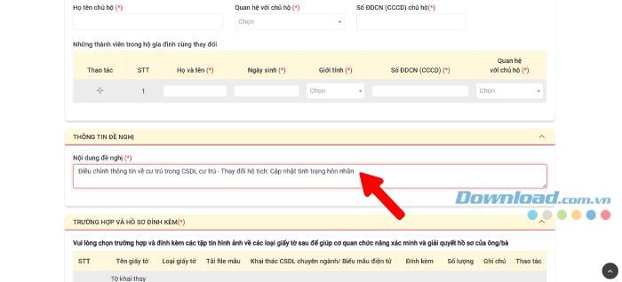 Bước 5: Ở phần nội dung đề nghị, nhập thông tin Cập nhật tình trạng hôn nhân vào ô tương ứng.