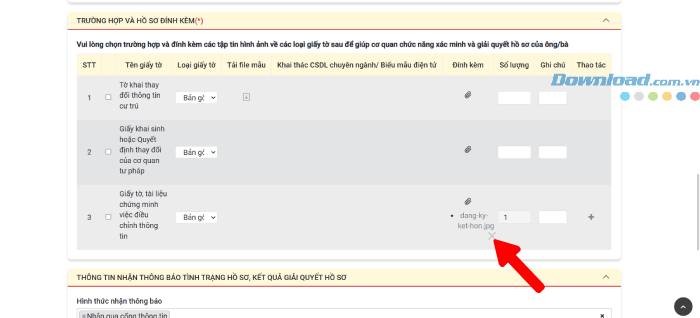 Bước 6: Tại mục hồ sơ đính kèm, phần 3 - Giấy tờ, tài liệu, người dùng cần tải lên ảnh chụp giấy đăng ký kết hôn để làm bằng chứng.