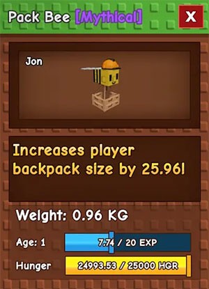 Chức năng của Pack Bee vô cùng đơn giản. Khi sở hữu Pack Bee và thú cưng này đã trưởng thành, dung lượng ba lô của người chơi sẽ được tăng thêm khoảng 26 ô. Dung lượng này cũng sẽ tiếp tục tăng lên một chút theo thời gian khi ong sinh trưởng và già đi trong lô đất.