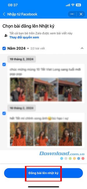 Bước 5: Kiểm tra lại danh sách các bài đăng và nhấn Đăng bài lên nhật ký để hoàn tất việc chuyển bài đăng từ Facebook sang Zalo. Như vậy, toàn bộ bài viết Facebook trong khoảng thời gian bạn đã chọn sẽ được đăng lên nhật ký của Zalo.