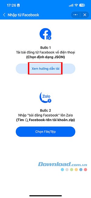 Bước 3: Tiến hành tải các bài đăng từ Facebook về điện thoại của bạn. Bạn có thể nhấn vào Xem hướng dẫn tải để nắm rõ các bước thực hiện chi tiết.