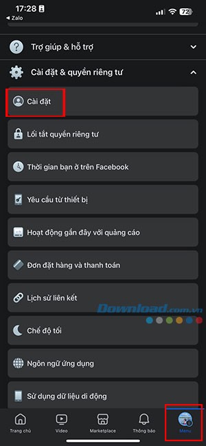 Để tải bài đăng từ Facebook xuống dưới dạng file JSON, trước tiên bạn cần mở ứng dụng Facebook. Truy cập vào tab Menu và chọn Cài đặt, nằm trong mục Cài đặt và quyền riêng tư.