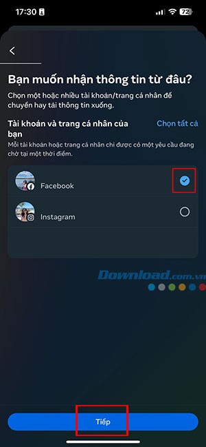 Tiếp theo, chọn tài khoản Facebook mà bạn muốn tải thông tin xuống. Sau đó, nhấn Tiếp để xác nhận.
