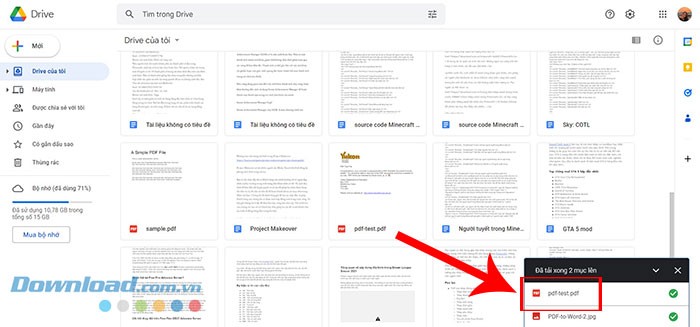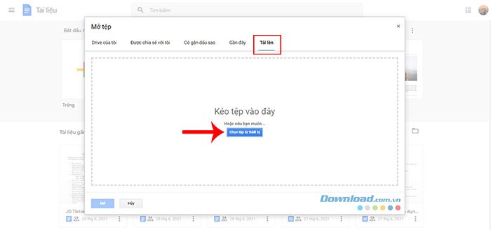 Bước 2: Trong cửa sổ hiện ra, lựa chọn Tải tệp lên. Tiếp theo, nhấp đúp vào tệp PDF cần chỉnh sửa để tiến hành tải lên Google Drive.