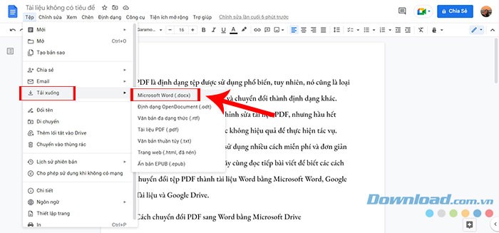 Bước 6: Từ menu vừa hiển thị, chọn Tải xuống và sau đó chọn định dạng Microsoft Word (.docx) để lưu tài liệu dưới dạng tệp Word.