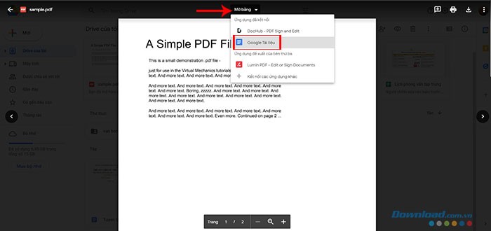 Bước 4: Khi tệp đã được mở, chọn Mở bằng, sau đó chọn Google Tài liệu từ cửa sổ pop-up để mở tệp PDF trong Google Docs.