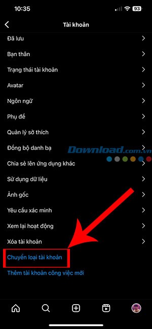 Bước 3: Kéo xuống phía dưới cùng của trang cài đặt Tài khoản, sau đó chọn mục Chuyển đổi loại tài khoản.