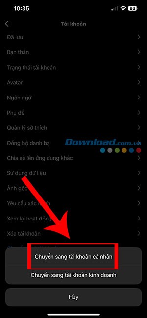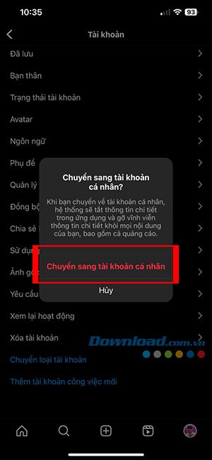Bước 4: Chọn Chuyển sang tài khoản cá nhân để tắt chế độ tài khoản chuyên nghiệp đang được kích hoạt.