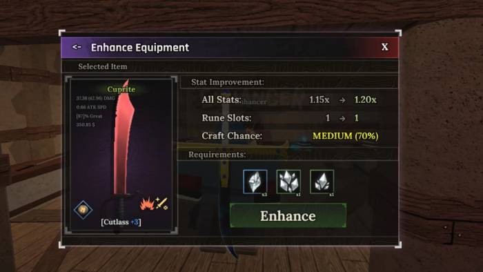 - NPC Enhancer được sử dụng để cải thiện trang bị như vũ khí và giáp, đòi hỏi người chơi phải sử dụng Essence và Gold.