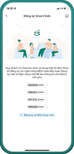 Bước 3: Hệ thống sẽ hiển thị danh sách các số điện thoại đã đăng ký với BIDV. Quý vị vui lòng chọn một số điện thoại để mở tài khoản phụ cho con và chuyển sang bước 6.