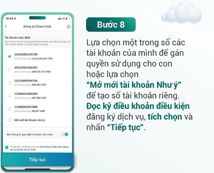 Bước 8: Quý vị có thể lựa chọn một trong các tài khoản hiện có của mình để gán quyền sử dụng cho con, hoặc nhấn vào Mở mới tài khoản Như ý để tạo một số tài khoản hoàn toàn mới.