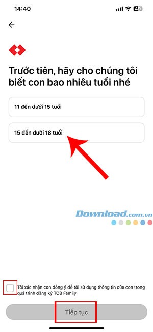 Bước 3: Tiến hành xác nhận độ tuổi của trẻ, lựa chọn giữa khoảng tuổi 11 đến dưới 15 hoặc 15 đến dưới 18. Đánh dấu vào ô xác nhận và chọn Tiếp tục.