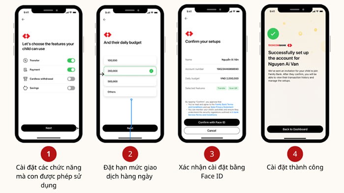 - Thiết lập giới hạn giao dịch hàng ngày cho con, với mức tối đa là 2 triệu đồng/ngày theo quy định của Techcombank đối với dịch vụ TCB Family.