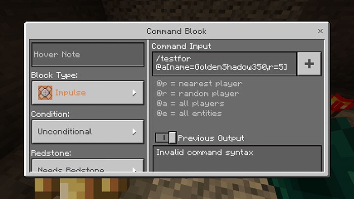Ngoài ra, người chơi cũng có thể sử dụng khối lệnh để thực thi các lệnh. Khối lệnh đặc biệt hữu ích vì chúng có thể kích hoạt nhiều loại input lệnh khác nhau, tạo điều kiện cho việc xây dựng các chuỗi lệnh tự động.
