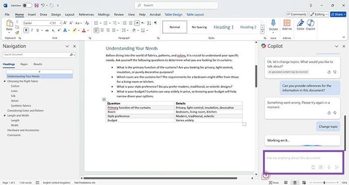 Khi cần tìm kiếm thông tin cho bản thảo, người dùng có thể đặt câu hỏi cho Copilot để tiến hành nghiên cứu, thu thập ý tưởng hoặc tinh chỉnh nội dung hiện có. Đôi khi, công cụ này có thể đưa ra những thông tin không hoàn toàn chính xác, nhưng lại khơi gợi nguồn cảm hứng sáng tạo bất ngờ.