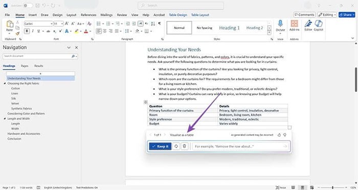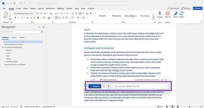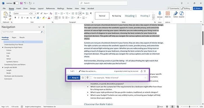 Văn bản do trí tuệ nhân tạo (AI) tạo ra đôi khi có thể chứa những điểm chưa chính xác, nhưng lại mang tính hữu ích, do đó người dùng cần tự mình điều chỉnh để đảm bảo phù hợp. Quá trình này có thể được thực hiện thủ công, hoặc tận dụng sự hỗ trợ của Copilot để giảm bớt gánh nặng công việc.