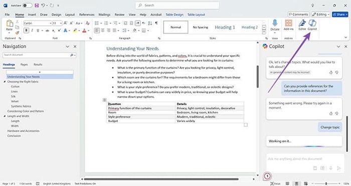 Bước 3: Trong một số trường hợp, Copilot có thể gặp khó khăn trong việc đưa ra câu trả lời phù hợp. Nếu điều này xảy ra, hãy thử diễn đạt câu hỏi theo một cách khác. Ngoài ra, nếu ứng dụng Word bị treo hoặc phản hồi chậm trong khoảng thời gian từ 3 đến 5 phút, bạn nên khởi động lại chương trình.