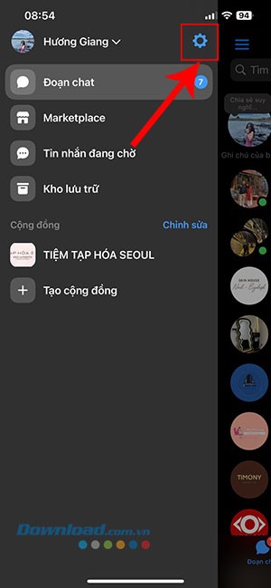 Bước 2: Trong menu hiện ra, chọn biểu tượng cài đặt, thường có hình bánh răng, nằm ở góc trên cùng bên phải.