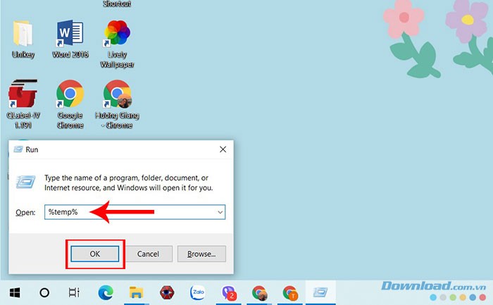 Nhấn tổ hợp phím Windows + R để mở hộp thoại Run, sau đó nhập %temp% và nhấn OK hoặc Enter.