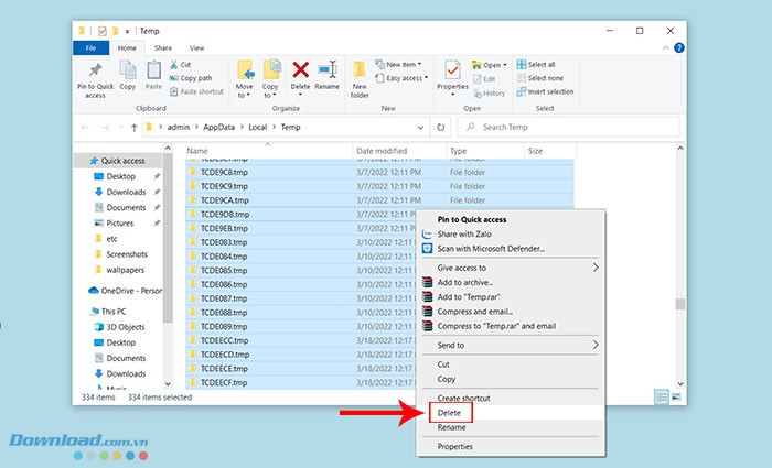 Một cửa sổ mới sẽ hiển thị tất cả các tệp tạm thời trên máy tính. Những tệp này không cần thiết và bất kỳ chương trình nào cần chúng sẽ tự động tạo lại. Nhấn Ctrl + A để chọn tất cả, nhấp chuột phải và chọn Delete để xóa chúng.