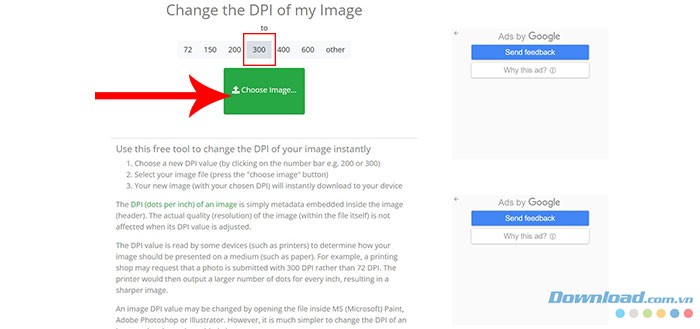 Để thay đổi DPI ảnh, hãy truy cập công cụ DPI Convert Online , chọn nút Choose Image để tải ảnh lên và chọn 300.