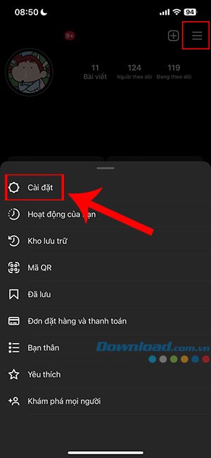 Bước 2: Tiếp theo, chạm vào biểu tượng ba gạch ngang, được đặt tại góc trên cùng bên phải giao diện. Sau đó, lựa chọn mục Cài đặt.