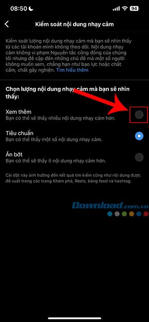 - Việc điều chỉnh cài đặt là một phương án. Bạn có thể truy cập vào mục Cài đặt, sau đó chọn Nội dung gợi ý và tiếp tục chọn Nội dung nhạy cảm. Tại đây, lựa chọn Xem thêm sẽ cho phép bạn tiếp cận nhiều nội dung hơn.