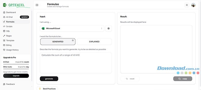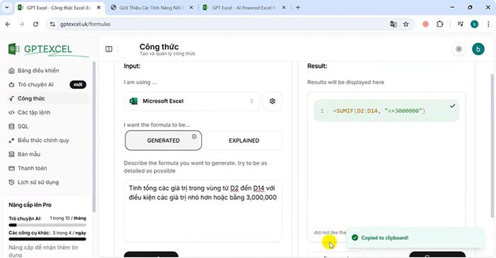 Nhấn nút Generate (Tạo) để kích hoạt quá trình tạo công thức bằng AI. AI sẽ phân tích mô tả bạn đã cung cấp và tạo ra công thức tương ứng. Quá trình này thường diễn ra rất nhanh chóng, chỉ mất vài giây, tùy thuộc vào độ phức tạp của công thức. Sau khi hoàn tất, công thức sẽ được hiển thị rõ ràng ngay bên dưới ô nhập liệu.