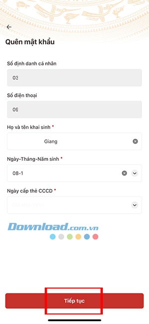 Bước 3: Điền đầy đủ thông tin cá nhân cần thiết, bao gồm Họ và tên khai sinh, Ngày tháng năm sinh và Ngày cấp thẻ CCCD. Sau khi kiểm tra tính chính xác, nhấn vào Tiếp tục.