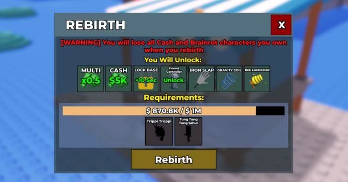 Để mở khóa các vật phẩm mới, người chơi cần đạt đến một số cấp độ Rebirth nhất định. Ví dụ, Diamond Slap chỉ có thể được mua sau khi đạt Rebirth 3. Giá thành của mỗi vật phẩm cũng sẽ tăng lên theo cấp độ.