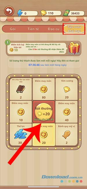 Điểm may mắn đóng vai trò quan trọng, cho phép người chơi sở hữu những vật phẩm quý hiếm nhất trong suốt quá trình trải nghiệm trò chơi. Trong giao diện Tiệc rượu khai mạc thuộc tab Cửa hàng, hãy chọn nút Rút thưởng để có cơ hội nhận các phần quà giá trị.