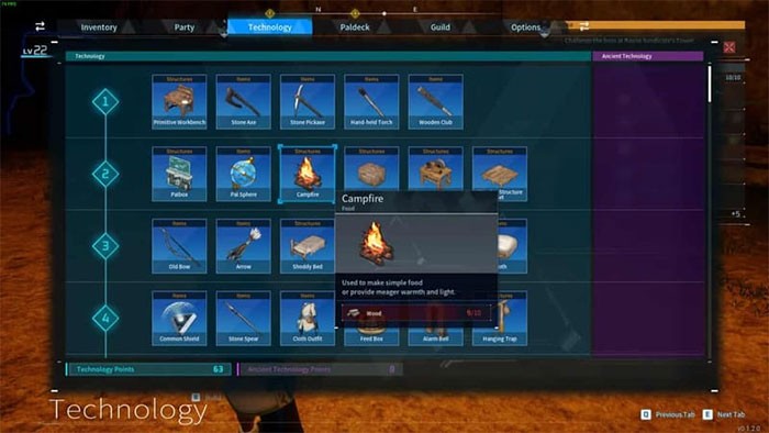 Sau đó, hãy mở kho đồ bằng phím tắt Tab, sau đó điều hướng đến tab Technology. Tại hàng thứ hai, chọn Campfire và sử dụng 1 Technology Point để mở khóa công thức chế tạo.