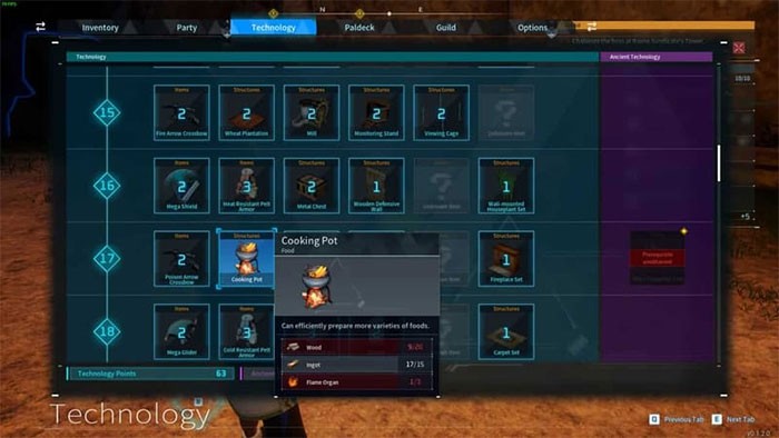 Khi người chơi tiến bộ trong trò chơi, họ sẽ mở khóa được Cooking Pot. Thiết bị này có sẵn trong tab Technology khi đạt cấp độ 17 và yêu cầu 2 Technology Point để mở khóa. Bên cạnh các công thức nấu ăn cơ bản tương tự như Campfire, Cooking Pot cho phép nấu nhiều loại món ăn khác nhau với hiệu quả cao hơn. Việc chế tạo Cooking Pot đòi hỏi 3 Flame Organ, 15 Ingot và 20 Wood.