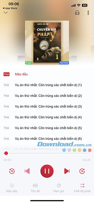 Bước 4: Giao diện phát audiobook trên MyDio được trình bày như hình minh họa dưới đây. Tại đây, bạn có thể tùy chỉnh các chức năng như Sắp xếp trình tự các chương, điều chỉnh Tốc độ phát lại, cài đặt Hẹn giờ để tự động tắt và lựa chọn Chế độ phát lặp lại.