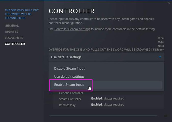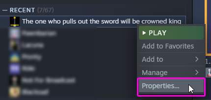 Để bắt đầu, bạn cần kích hoạt chế độ nhập liệu Steam. Hãy mở thư viện Steam của mình, sau đó nhấp chuột phải vào tựa game The one who pulls out the sword will be crowned king và chọn mục Properties.