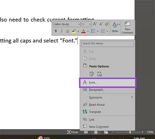 Bước 1: Trong giao diện Word, hãy nhấp chuột phải trực tiếp lên phần văn bản đang hiển thị in hoa và chọn mục Font từ menu ngữ cảnh.
