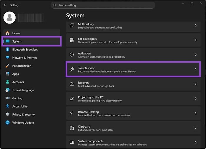 Bước 2: Chọn tab System, sau đó nhấp vào mục Troubleshoot.