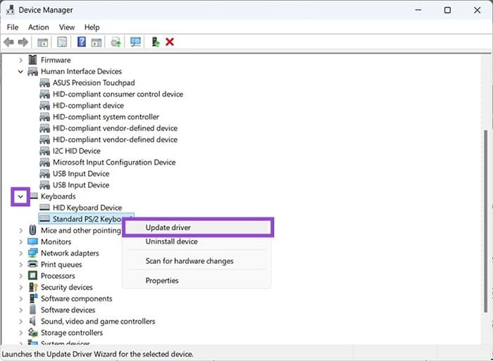- Mở rộng danh mục Keyboards và chọn thiết bị bàn phím đang gặp vấn đề.