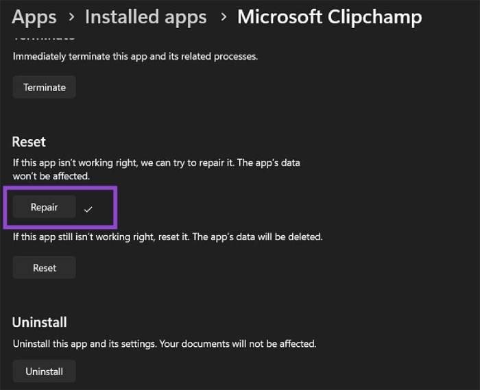 Nếu sau khi sửa chữa, ClipChamp vẫn gặp sự cố, bạn có thể chọn đặt lại ứng dụng. Thao tác này sẽ xóa toàn bộ dữ liệu và đưa ứng dụng về trạng thái ban đầu.