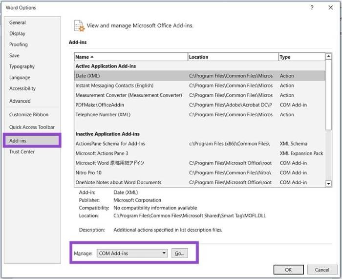 Bước 3: Ở phần cuối cửa sổ, chọn Manage: COM Add-ins > Go.