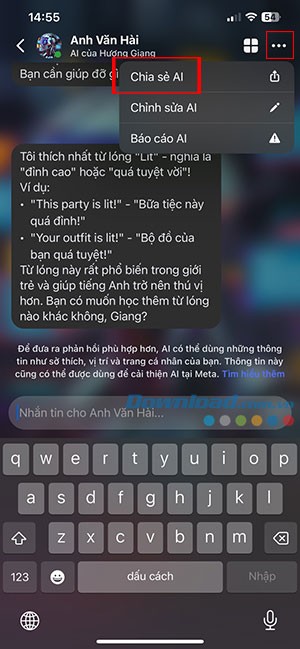 Bước 6: Khi bạn đã hài lòng với kết quả, hãy chia sẻ nhân vật AI của mình lên các mạng xã hội để thu hút sự tương tác từ những người khác. Chỉ cần chạm vào ba dấu chấm ở góc trên cùng bên phải cuộc trò chuyện, sau đó chọn Chia sẻ AI.