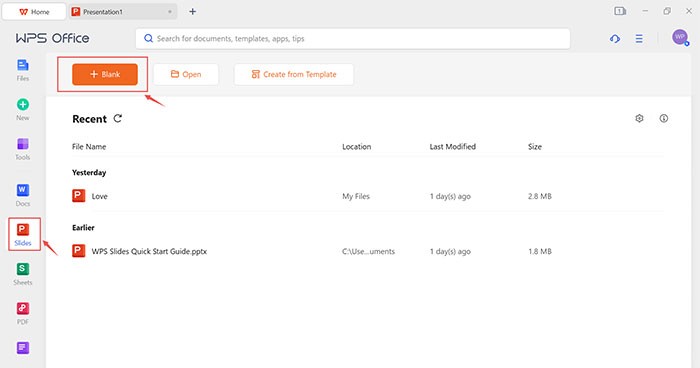 Bước 2: Tại giao diện chính, lựa chọn Slides, sau đó chọn Blank để bắt đầu một bản trình chiếu mới.