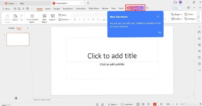Bước 3: Nhấn vào nút Create with AI để kích hoạt tính năng WPS AI Slides.