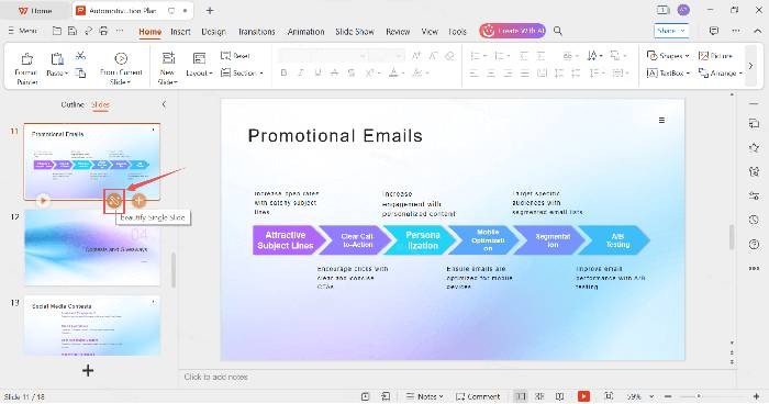 Ví dụ, để chèn một timeline vào slide giới thiệu về các chiến dịch Email Quảng bá, người dùng chỉ cần chọn biểu tượng Beautify Single Slide. Hệ thống sẽ nhanh chóng phân tích và xác định slide thuộc kiểu Body. Đồng thời, trong mục FlowerChart, AI cũng nhận diện được rằng slide hiện tại chứa từ sáu thành phần trở lên.